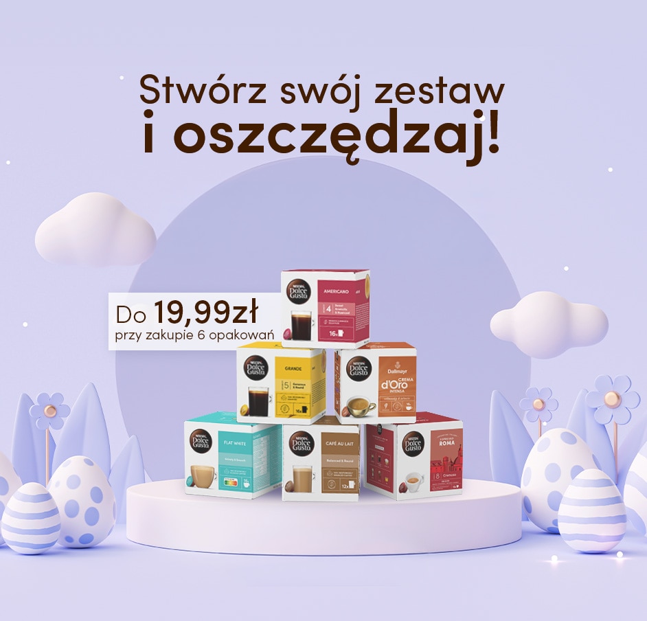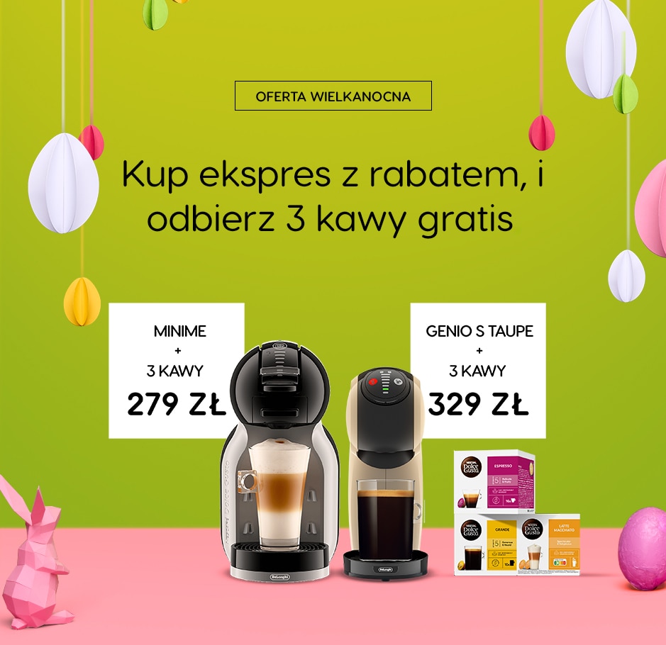 Przy dodaniu do koszyka ekspresu Mini Me oraz dowolnych 3 kaw NESCAFÉ Dolce Gusto w formacie 12, 16 lub 18 kapsułek, cena zestawu w koszyku obniży się do 279zł! Przy dodaniu do koszyka ekspresu Genio S Taupe oraz dowolnych 3 kaw NESCAFÉ Dolce Gusto w formacie 12, 16 lub 18 kapsułek, cena zestawu w koszyku obniży się do 329zł!