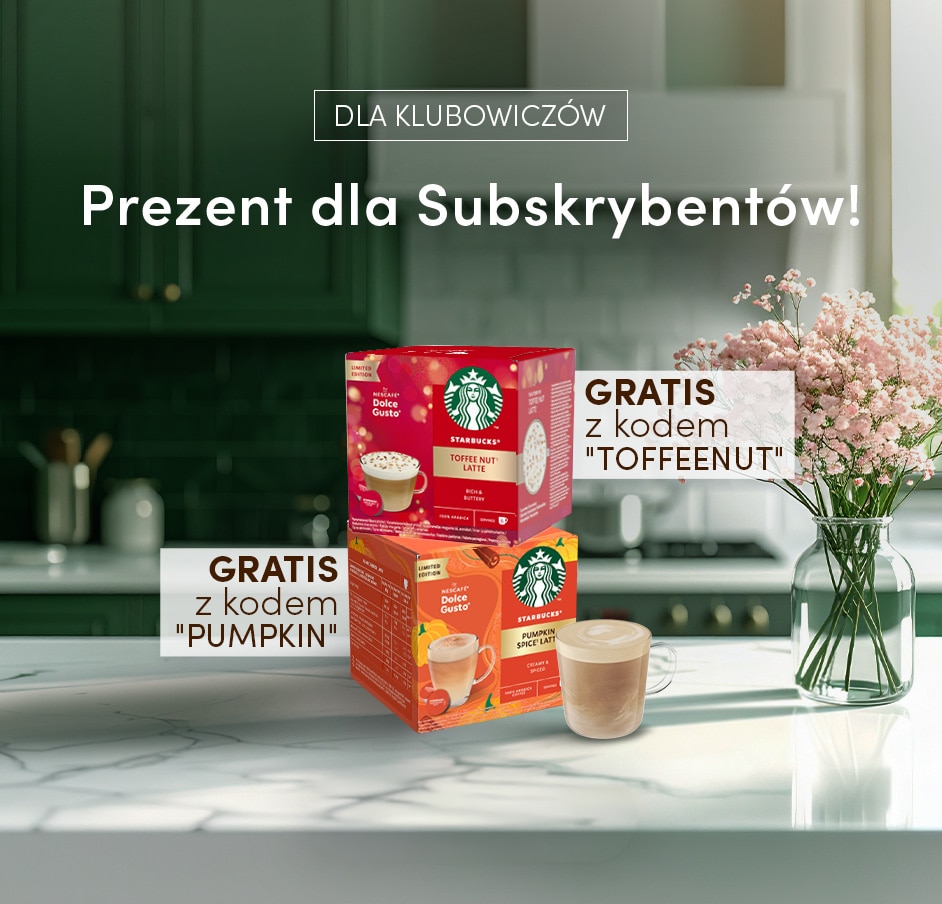 Dla każdego Subskrybenta do każdego zamówienia powyżej 119,99 zł oraz po wpisaniu kodu rabatowego zostanie dodana darmowa kawa Starbucks® by NESCAFÉ® Dolce Gusto® Toffee Nut Latte (kod:TOFFEENUT) lub Starbucks® by NESCAFÉ® Dolce Gusto® Pumpkin Spice Latte (kod: PUMPKIN)!